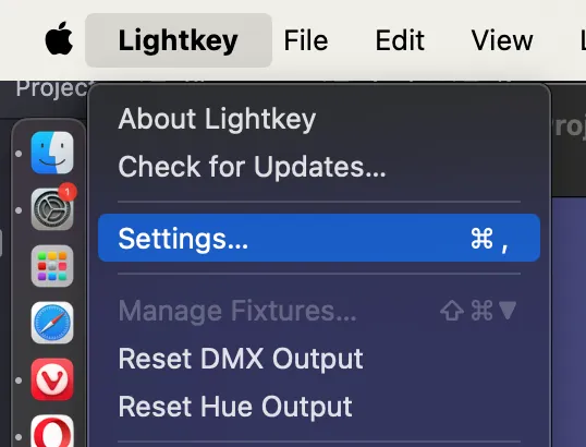 Section titled “LightKey Settings”Lightkey is a little weird about network settings, so I’d recommend using Broadcast mode even though it spams the network a bit. If you have a project open, network options are in settings.